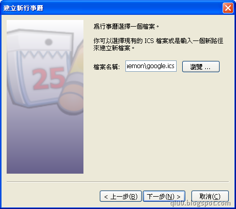按瀏覽,到安裝GCALDaemon路徑下,選擇google.ics,按下一步