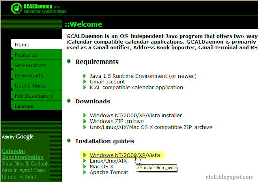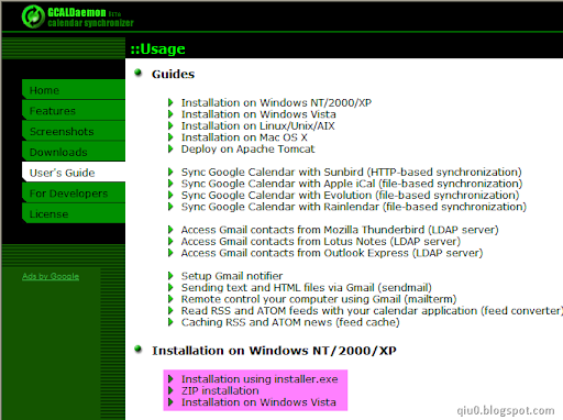 接著就開始動手設定嚕,首先,先到GCALDaemon官方首頁,分別可以看到幾個大項