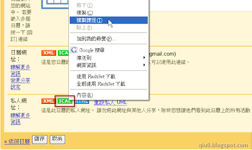 到頁面最下方,在"私人網址"中的ICAL icon按右鍵出現功能選單,選擇 "複製捷徑"